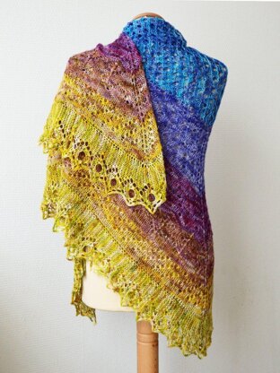 Start the Full Fade Hap at one corner of the center square and increase until big enough, then decrease. Pick up stitches along the edges, and work the stunning border outwards. Each color band in its own lace patterning. The shawl is finished with a gorgeous edging that is knitted on sideways and attached to the live stitches of the border as it is being worked.