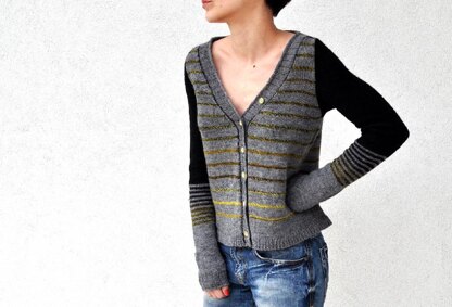 This retro inspired cardigan has an ample and boxy shape - which is updated by it’s extra long sleeves and fun stripes in different sequences. The deep feminine neckline and the use of blocks of colour add interest and enhance the overall shape by modernizing an otherwise traditional and masculine garment. It is completely seamless and worked almost in one piece, from the top down. The sleeves and the buttonband are done with short rows and by picking up stitches from the body. The resulting garment is very light and comfortable, since it is done out of fingering weight sock yarn.