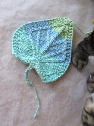 Furballs' Leafy Salad 3 is 5" x 5" / 12.7 cm x 12.7 cm heart shaped leaf coaster with central and side veins. It can also be double as cosmetic removal pad. It has a stockinette background and bordered with a garter stitch Both interesting and easy to knit, it has an interesting start (promise you wont be falling asleep while knitting lol) and using two (2) different techniques to construct the heart shape.