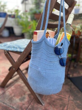 Strips of stitches worked in horizontal openwork add interest and visual delight to this market tote with I-cord straps. This bag is worked in the round from the bottom up.