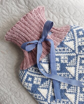 A beautiful hot water bottle cover in 4ply yarn. It starts with a provisional cast-on and is knitted in the round. The stitches at the lower edge are grafted together, and the rib cuff includes eyelets to thread with ribbon.