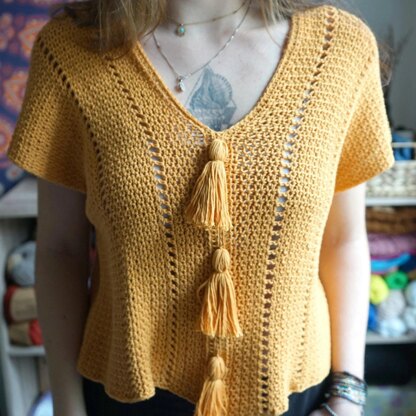 Il top è leggero e traspirante, creato con un punto principale (il punto Mesh) che dona al top un look traforato, creando una magliettina fresca e vivace. Le nappine aggiungono un tocco divertente e Boho all'outfit generale.