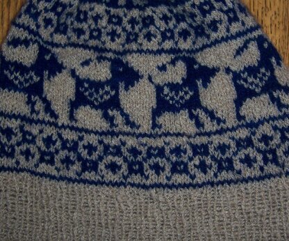 A fun cap for men or women (fits average adult) has cashmere goats chasing each other round this colorwork cap (two colors worked in each round).