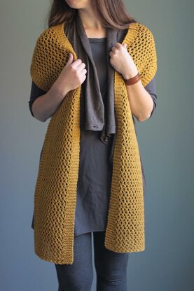 Garbanzo is a wide scarf/wrap that features an interesting textured stitch pattern that is fun to knit while still being easy to create. Using heavy worsted/aran-weight yarn on a larger-than-usual needle creates a more airy stitch pattern that opens up beautifully after blocking.