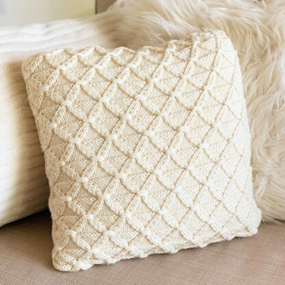 Garden Lattice Pillow is knit seamlessly in the round. Instructions are both charted and written and include directions for an optional button flap.