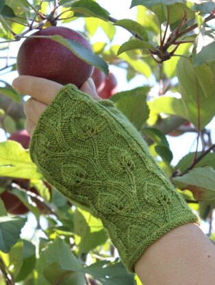We were apple-picking when I shot the photo of these fingerless gloves, and I just couldn’t resist the name. The vines are embossed, so they stand out in high relief, and the occasional eyelet on the leaves provides further contrast. An asymmetrical thumb gusset provides a contoured fit. Turn the glove inside out, and you have an entirely different look!