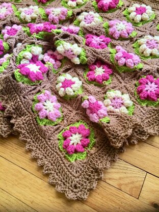 Rows of pastel flowers, green leaves and a woodsy border all spell garden party! Five colors, six skeins makes for an affordable gift! Join as you go squares make for a quick project. You can certainly make all your squares and join together in your favorite method.