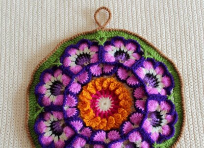 Bring this garden of flowers to your kitchen or favorite room, Garden Pot Holder is the most easy and fun project, you will be surprise on how fast you can crochet this unique piece, using 5 or 6 yards in 8 or 9 colors, as you can see I made Garden Por Holder in 4 colors version, using the basic crochet stitch, this pattern is great for all crochet beginners.
