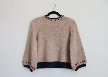 This garment is worked flat in pieces from the bottom up. Shoulder stitches are seamed together and then sleeves are set in. Body sides and sleeves are then seamed together with mattress stitch. Finally the neckline stitches are picked up and stranded colorwork bobbles are worked to an I-cord bind off button closure.