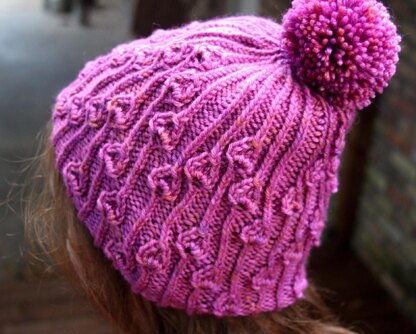 So, a rosebud hat. The rosebuds are formed by increasing a bunch of stitches into one stitch, then gradually decreasing them away. The stems are formed with twisted stitches to make them more distinct. Once you've worked a few rounds of the rosebud pattern, you'll find that it's pretty intuitive to knit, and you likely won't even need the chart anymore.
