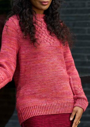 Notes: The pullover is worked back and forth in separate pieces and seamed. The neckband is worked double in the round.