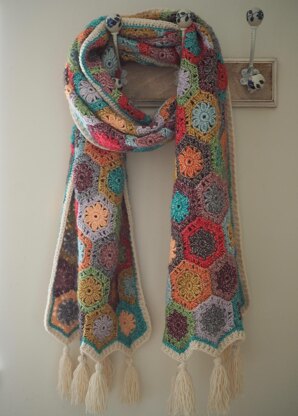 Crocheted scarf made of hexagons using 12 different colours of Scheepjes Stonewashed yarn and a natural colour for the border and tassels. I've written it in UK terminology and included a short video to show how I do the join-as-you-go method, and a link to Cherry Hearts tassel tutorial.
