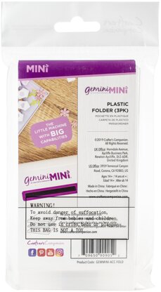Roll your tiny dies and embossing folders through the Gemini Mini with these plastic folders. Each of these folders has been perfectly sized to fit the Mini and flip open to house your dies or embossing folders inside. With three in each set, you'll have plenty to get started! This package contains three 6x3 inch plastic folders. Imported.