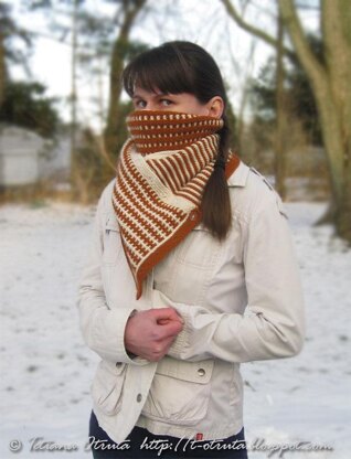 Geometric Illusion Cowl/Scarf is worked sideways with button band or joined in the round with 3 needle bind off. Combination of 3 different two color patterns (stripe and slip stitch patterns) create an asymmetric color change illusion and create a personal, unique look every time to be worn.