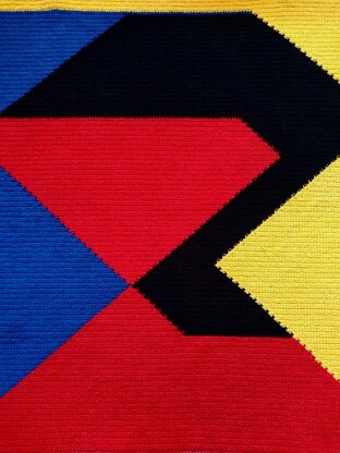 The rug is worked using the Intarsia technique. This pattern was created from leftover yarn and the idea of creating a geometric design with large areas. The design emerged while the piece was weaving and for this reason the recipe does not have a graphic.