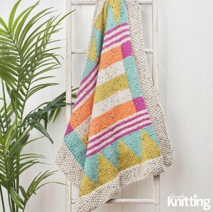 This is a pattern for a geometric shapes throw, originally published in Simply Knitting. It is worked in intarsia with moss stitch edges in a chunky tweed yarn. Photos Simply Knitting.