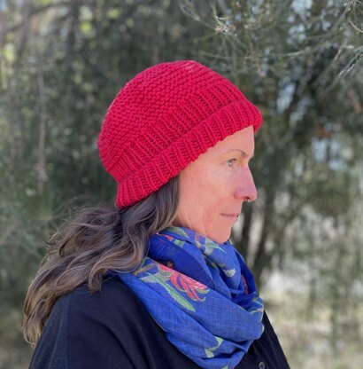 " Water them Geraniums " is my favourite short story by Australian author Henry Lawson as it captures a woman's resilience during a time of drought . When Australia experienced drought then bushfires then Covid 19 , I remembered that story as I was designing these beanies . There's one fitted one and one slouchy one . I used Kaalund Yarns Puggle from their family run fibre mill on the Sunshine Coast in Queensland . It's from non mulesed sheep . The two colours are Flame Tree and Ocean .