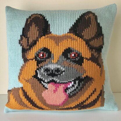 Knitted cushion cover pattern featuring a handsome German Shepherd!