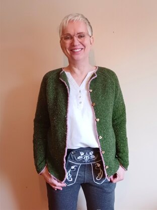 The “German Staple” raglan sleeve cardigan is exactly that – a wardrobe staple that goes with anything. It is knitted from the top down with raglan sleeves, and features the traditional garter stitch fabric with a small heart in stranded colour work on the back.