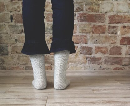 Get closer socks are knitted cuff-down, with knit and purl texture, that looks like spine of leaf, texture continues on the heel flap and toe, only bottom of the foot is knitted in stockinette.