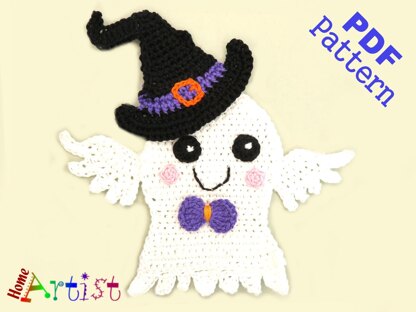 The pattern provides instructions to make a cute crochet applique that can be used in inumerable ways...decorate and personalize your favorite objects like hats, t-shirts, bags, school knap-sacks and lots of other stuff you can think of. Ghost: 4 ½ inches across by 4 inches tall Hat: 3inches across by 3 1/2 inches tall but the size can be varied by using thinner or thicker yarn and types of hook. Colors can be changed according to your personal preference. The pattern is designed for worsted weight yarn and uses American English crochet terms.