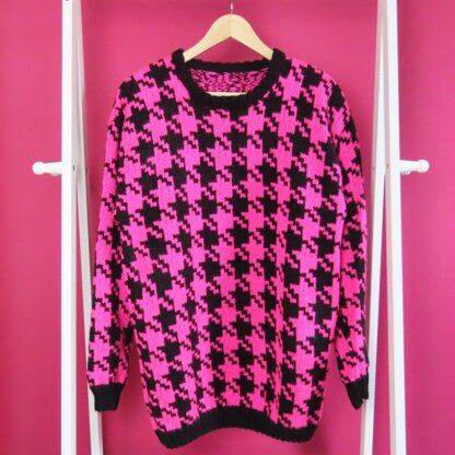 This over-sized jumper in a super bold giant houndstooth pattern is worked using the stranded method. It also looks great in the more traditional black and white colour combo if you prefer! This pattern is in multiple sizes to fit chest/bust from 81cm/32in up to 122cm/48in. Techniques include knit and purl stitches, stranded colour work from a chart, increases and decreases and picking up stitches.