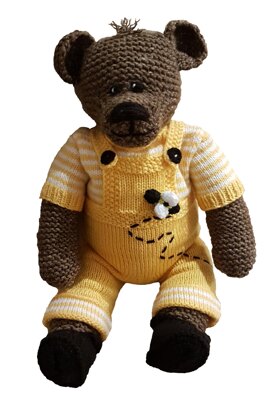 It's easy and quick to knit - using chunky yarn for Giggles who is wears underwear pants being part of the body pattern. The 3-piece outfit is knitted with DK yarn. The outfit Giggles is wearing consists of a jumper, dungarees and shoes with false shoe laces. Even the buttons of the dungerees are knitted