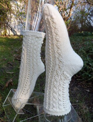The cream colored socks are knit from the toe up. The blue socks were knit from the top down. Whichever construction method you choose, the lace shows itself beautifully.