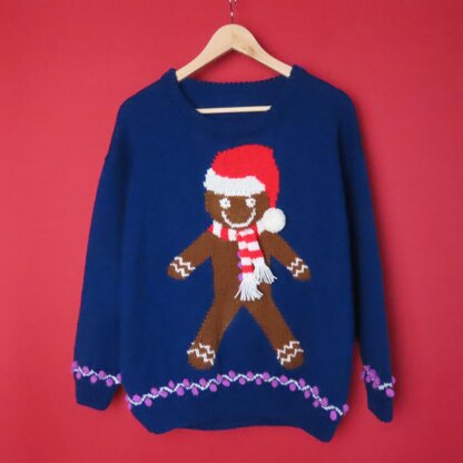 This loose fit Christmas jumper features a cheery Gingerbread man complete with 3d details including gum drop buttons, stripey scarf and pom-pom! It uses a mixture of techniques for the colour work - stranded for the icing border and intarsia for the main image. Techniques include knit and purl stitches, intarsia and stranded colour work from charts, bobble stitches, increases and decreases and picking up stitches.