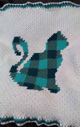 This Corner to Corner (C2C) blanket features a gingham cat and striped edging. The gingham effect is created by using three gradient shades of the same color. C2C is a simple technique that uses only chain, slip and double crochet stitches. Choose your own yarn and colors to make this your own. Finished size is perfect for a lap or baby blanket.
