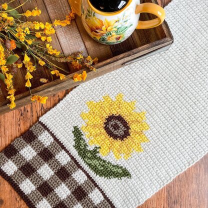A beautiful sunflower table runner with a country farmhouse feel. Modern crochet pattern with a vintage vibe!