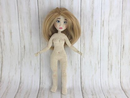 Doll (15"/38cm tall) with clothes crochet pattern, English, USA, PDF file with video links for sculpting face, body, and how to attach hair.