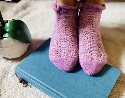 This pattern is knitted cuff-down. The cuff is a ruffles technique. The pattern includes instructions for DPNs and the ‘Magic Loop’ method.