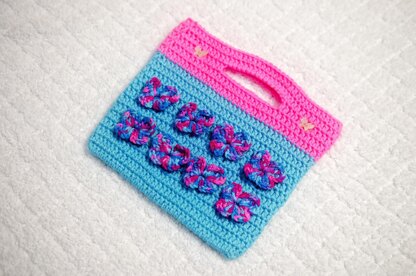 Now your little girl can carry a bit of springtime with her all year long. Crochet it in her favorite colors and embellish with butterfly buttons. Finished size is 5 1/2" tall x 6" wide. Use a larger or smaller hook to change size of purse. The color possibilities are endless.