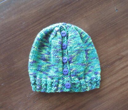 The hat has a mock cable ribbing for extra style (no cable needle required), but it’s worked primarily in stockinette, so it’s easy enough for a beginner, or a breeze for someone more experienced. It’s worked flat and the button bands are worked right along with the main part of the hat so there is no seaming and no picking up stitches. The buttons allow you to wear a ponytail high, low, or in between and allow for a little extra creativity if you want to choose fun buttons.