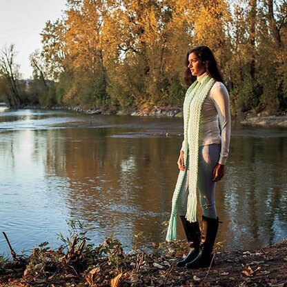 The Glacial Slide Scarf is worked flat length-wise in a modified garter stitch. Each garter row is knit twice by sliding stitches across a circular needle to work again with contrast color, before turning work to repeat with each color. Includes optional two-color fringe.