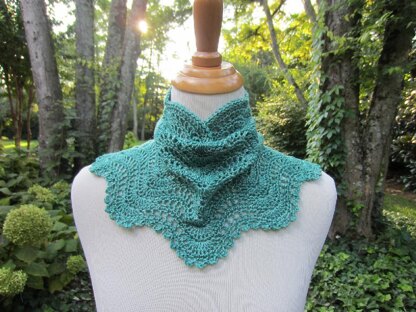 Glacier Cowl is a light and lacy cowl featuring a feather-and-fan pattern worked in the round. Gradual increases in the stitch count allow the cowl to gently fall on your shoulders along the lower edge.