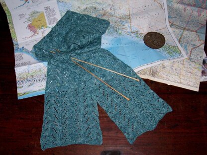 A light and lacy scarf that I designed while sailing along the coast of Alaska. Knit in a wool and silk blend it is a warm accessory for any traveler.