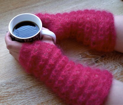 Glam it up in these shocking pink fingerless gloves! These beauties are knitted up in a super soft Mohair blend and are surprisingly warm despite being lacy. They are knitted in the round using double pointed needles up until the thumb hole which is knitted back and forth in rows, the yarn is then joined again in the round for the last few rounds to finish. These are a great starter project for any knitters new to working with Mohair or DPNs.