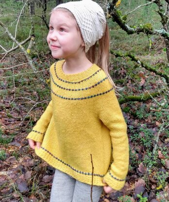 **Construction:**The pullover is knitted from top down seamlessly, in the round. It has a stretchy neckline (due to tubular cast on), 9-10cm / 3-4’’ of positive ease and has plenty of simple stockinette knitting in the round. Yoke, hemline and arm bands have a small attention catching lines of bubbles which look like glass beads. They are made in contrast color, perfect for using up small amounts of sports weight remains in your stash. Body has fake seams for better fit.
