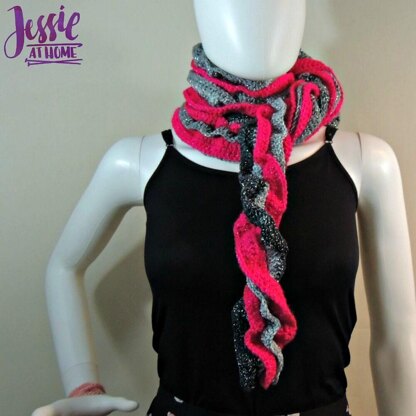 This pattern can be found for free online at jessieathome dot com/glitter-and-shine-scarf/