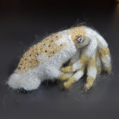 The squid and conch were made on 2 mm double pointed needles: the squid (16 cm) in a lace gauged (mohair) yarn and the conch (10 cm) in fine gauged yarn. The inner shell can be done in miniature or on thicker needles in heavier yarn (both options described).