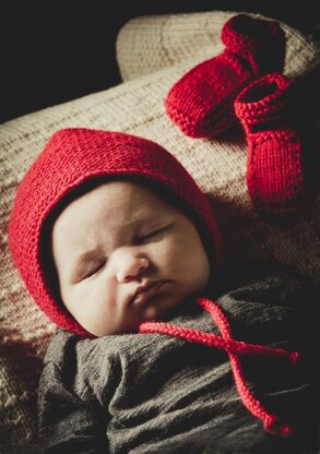 A sweet garter sticth baby bonnet with i-cord ties and easy knit Mary Jane shoes. A simple knit design and perfect to keep little heads warm on those cold wintery days.