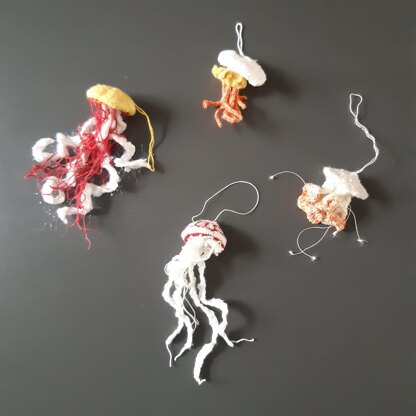 A jellyfish needs only a tiny amount of yarn, so you can use up any scraps you have lying around. Just adding a strand of phosphorescent sewing yarn to your knit, will make them glow in the dark. The jellyfish are an easy to medium project, made on 1.3 mm double pointed needles in a lace-gauged yarn with some knitting flat or in the round, intarsia color work, i-cord knitting and basic crocheting. They can also be knitted on larger needles in bulkier yarn and they will then turn out bigger.