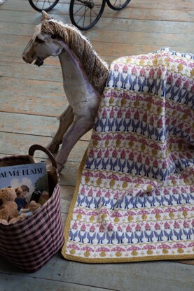 This cute blanket is knitted in Rowan Baby Cashsoft Merino and features two sweet motifs, a gnome and a toadstool, in alternating rows. A narrow garter stitch border in a contrasting mustard colour edges the blanket.