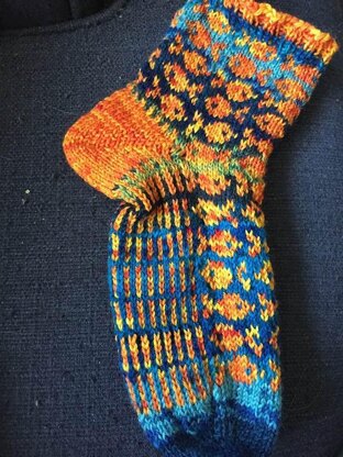 Using DROPS Fabel - Blue Lagoon Print (340) makes the background look like the fish are swimming in water. I really liked the outcome. I knitted these socks with yarn I had left over from other projects.
