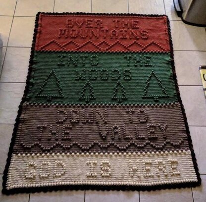 Reads : Over the mountains Into the woods Down to the valley God is here.