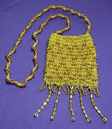 Pattern Description from One-Skein Wonders: 101 Yarn-Shop Favorites: "This bag has beads set only every four rows, making it a bit easier to knit than bags with beads set every row. The fringe uses a 'crossover' skill: beading with a beading needle and thread."