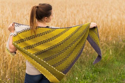 This triangular shawl in four different subdued colors lets you look like “Good Old Days” – it’s knit from one corner to the widest part with stitches picked up along the edge and wedges knit on the side of the shawl, more stitches picked up along the top edge and a small Aster stitch border added at the end, resembling narrow strips of fabric stitched together.