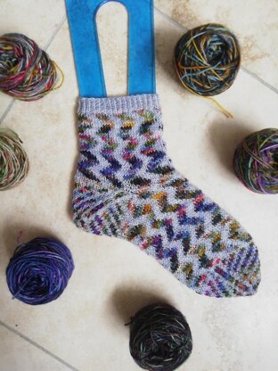 The Goosebumps Socks are a spooky celebration of colour through simple geometric patterns. These socks were designed with mini skeins or scrap yarn in mind but could just as easily be knitted with two contrasting colours. This stranded colourwork design includes a peasant heel.